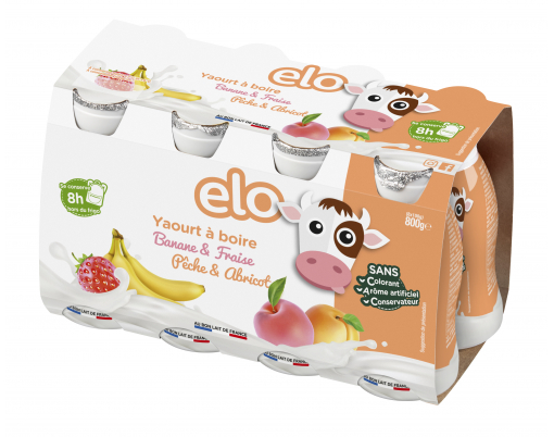 Yaourt à boire pêche/abricot et banane/fraise ELO 800g Pack de 8 bouteilles de 100g - Colis de 4 packs Voir le produit