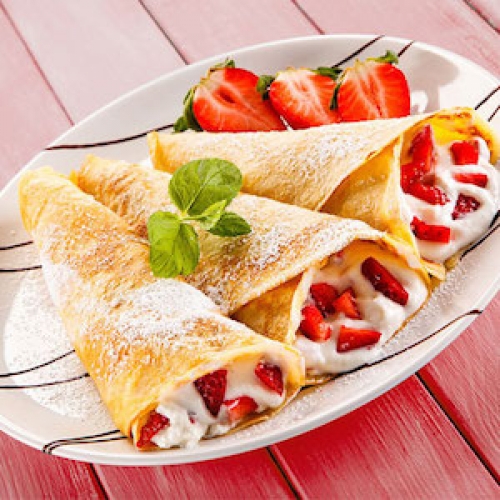 •Garnissez les crêpes de crème chantilly et de fraises puis roulez les crêpes en forme de cônes.