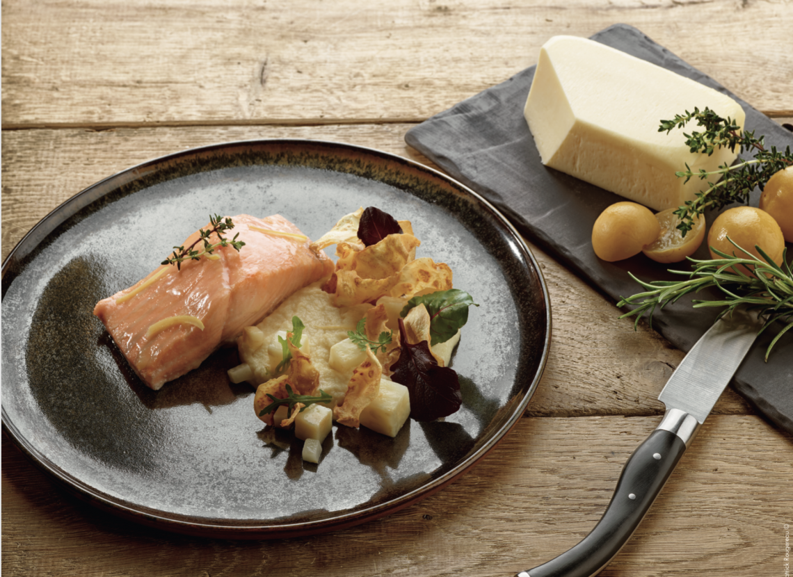 •Dressez le saumon confit avec le céleri en différentes textures, agrémentez de quelques jeunes pousses de salade.